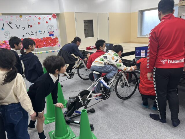 当日は、室内で楽しめる運動のほか、専用機材を用いたバーチャルサイクリング「Rouvy」の体験を行い、プロの選手から直接、乗車姿勢やペダリングの基本などを教わりました 。