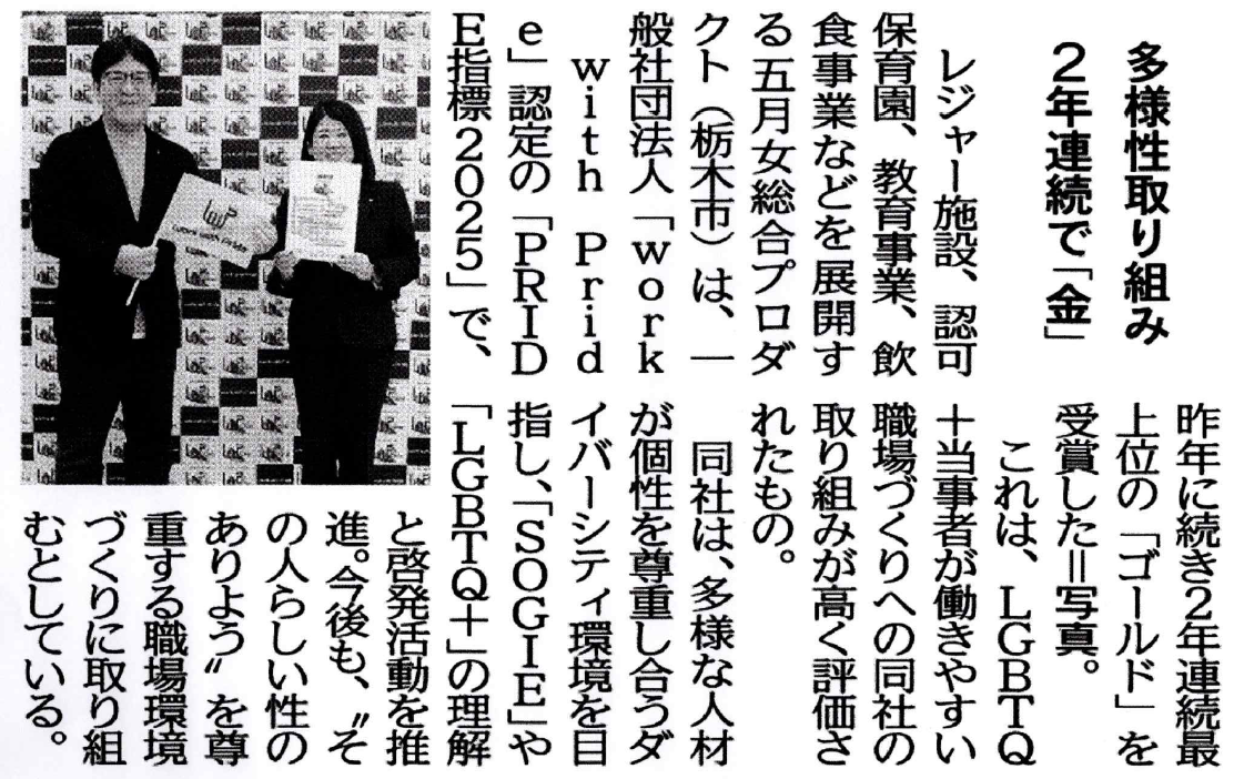 【下野新聞 11月24日】「PRIDE指標2025」2年連続で最上位評価のゴールドを受賞しました