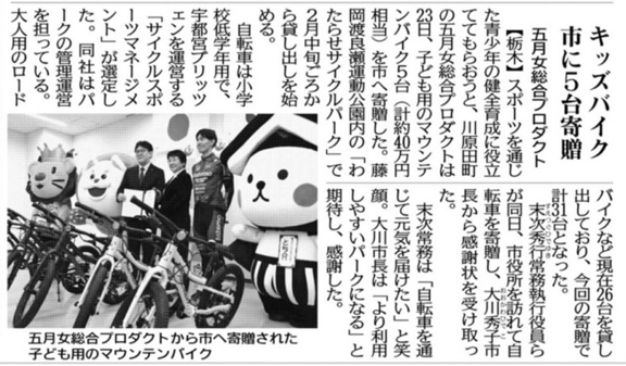 【下野新聞1月29日】栃木市「わたらせサイクルパーク」へキッズバイク5台を寄贈いたしました